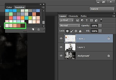 Start building a palette. This will be five skin tones that you will use. Press B for the Brush tool. Make sure the Opacity and Flow are at 100%. Hold down Alt and click on the lightest part of the face. Paint a 'swipe' or a 'stripe' of that color on the same layer. #* Hold down Alt and click on the darkest part of the face. Paint a 'swipe' or a 'stripe' of that color. Repeat the process for the midtones between the two and then repeat two more times, splitting the colors in half each time.