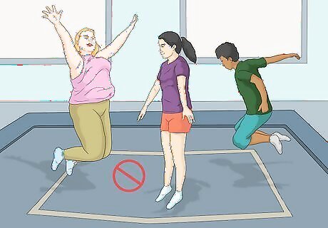 Stay off other people’s trampolines. One of the biggest dangers to individual safety at trampoline gyms are multiple jumpers on one surface. As a result, you need to make sure you never jump on a surface where someone is already jumping. If someone begins jumping on your surface, you should stop immediately and exit the surface. Inform anyone who wants to jump with you that it is a safety hazard.