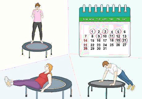 Incorporate bouncing into your overall exercise routine. Ultimately, trampoline time should be just one part of your over all work out. While it offers great cardio and limited weight training, it may not provide everything you need to meet your fitness goals. By using it as supplement to other types of training, you'll create an effective routine. Schedule two visits a week to the trampoline gym. For instance, weight train at a regular gym on Monday, Wednesday, and Friday, bounce at a trampoline gym on Tuesday and Thursday, and run or walk on Saturday and Sunday. Reserve simple cardio and aerobic exercises for the trampoline gym. For instance, save any impact related activity, like jumping jacks, for the trampoline gym. Think about reserving simple weight training exercises like pushups and sit-ups for the trampoline gym. This way you’ll be able to perform these exercises in a low-impact environment.