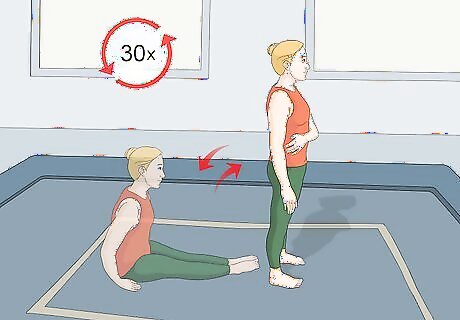 Complete a power bounce with lateral reach. The power bounce with lateral reach works out not just your lower body, but also helps work out and stretch your arms and shoulders. To complete a power bounce with lateral reach: Sit on the trampoline. Quickly stand up and bounce. Reach one arm across your body. Alternate your arms every bounce. Return to sitting. Repeat the sit, stand, reach, and bounce 30 times.