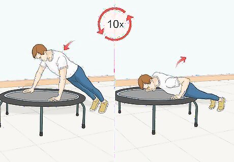 Do a trampoline pushup. Just as pushups are an important part of a regular workout, they are also very important in a trampoline-based workout. Trampoline pushups are a great low-impact activity that will help you improve your upper body strength. Use a 3 or 4 foot trampoline (.9 meters to 1.2 meters) Position your feet on the ground. Plank your body upward and position your hands on the trampoline. Push up and come back down 10 times.