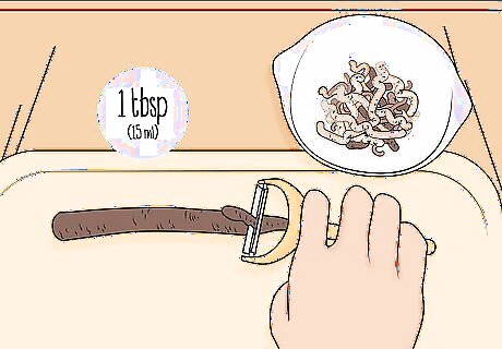Shred 1 tablespoon (15 mL) of the core with the peeler. Use your potato peeler to shred pieces of the core into a bowl. Finer shreds of the root will produce a stronger tasting tea and thicker shreds will make the tea taste milder. Continue shredding until you have enough burdock root to make tea. If you’re making tea for more than 1 person, shred 1 tablespoon (15 mL) of root per person. You can also use a cheese grater to shred the burdock root, but it will make tea with a strong flavor.