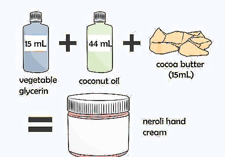 Make a neroli hand cream to heal chapped hands. Your hands may become dry and chapped in cold weather, or if you frequently wash your hands. While there are many hand creams on the market that will heal and protect your skin, you can also make your own. Start with 0.5 fl oz (15 mL) of cocoa butter, 1.5 fl oz (44 mL) of coconut oil, and 1 US tbsp (15 mL) of vegetable glycerin. Add 4 drops of neroli oil and 4 drops of frankincense oil. Stir the mixture until it is completely blended, then store it in a small jar, such as a baby food jar or a leftover moisturizer jar.