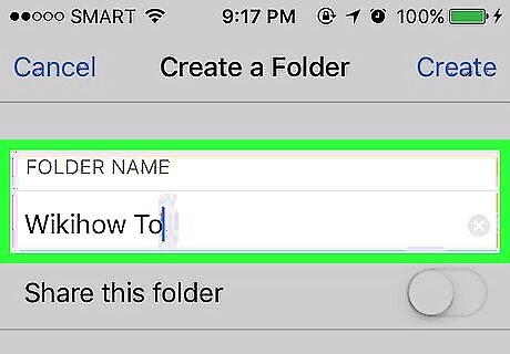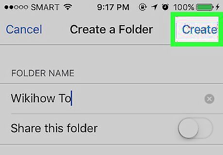 Tap Create. This option is in the top-right corner of the screen. Doing so will create your folder and place it on your OneDrive's main page. You can also first slide Share this folder right to the "On" position to view options for sharing the folder with other Microsoft users.