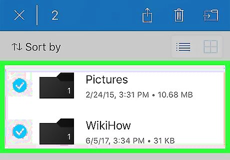 Tap and hold a document or folder. Doing so will both select the file and place OneDrive in select mode, meaning that any subsequent documents you tap will be selected as well. A bar with selection options will also appear at the top of the screen: "Share" button - The upward-facing arrow here will allow you to send your selected document(s)/folder(s) via Apple Message, email, or social media. Trash can - Delete the selected item(s). You'll have to tap Delete when prompted to confirm. Folder icon - Allows you to move the selected item(s) to any folders in your OneDrive. Parachute icon - You'll see this if you select one individual file. This icon makes your selected file available offline. ⓘ - You'll see this if you select a folder. Tapping it will display information about the folder. ⋮ - Top-right corner of the screen. This option allows you to rename the file or open it in another supported app.