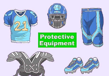 Wear proper protective equipment. Good safety equipment is crucial to preventing injury in many types of sports. Use all the recommended equipment for your sport, and check your equipment regularly to make sure it is not worn out or damaged. If you play a contact sport like hockey or football, you will need equipment such as shin pads, a helmet, and a face guard. High-quality, well-fitting shoes can also help prevent injury to your ankles, feet, and knees.