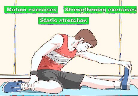 Adjust your rehabilitation routine as needed. Your rehabilitation program will need regular adjustment as you progress through the recovery process. Early sessions will probably focus mainly on treating the injury, while later phases of the physical therapy process will be more geared toward building strength and restoring your range of motion. The 3 main phases of physical therapy are: The acute phase. During this phase, your therapist will focus on managing pain and inflammation, as well as protecting the injured area so that it has time to heal. The subacute phase. Therapy during the subacute phase focuses on helping you gradually strengthen the area and restore your range of motion. The chronic phase. At this point, your therapist will begin working on getting you prepared to return to your regular pre-injury activities and exercise routines.
