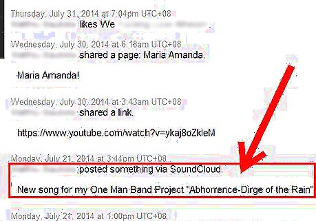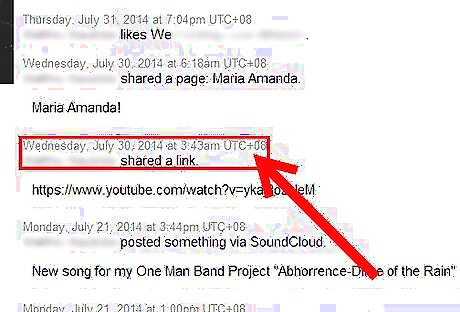 Look for lines that don't have a date and time attached to them. These are lines that contain status messages or comments (shared with some links) you've posted to Facebook.