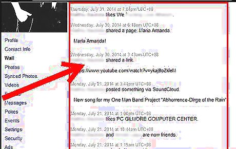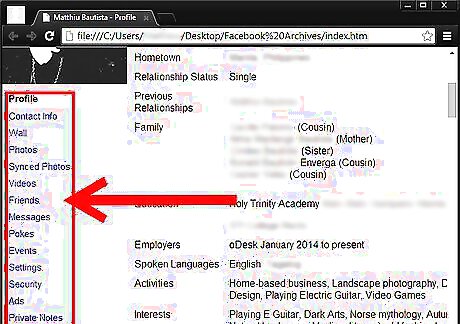 Look at the left column on the page. This column will help you sort through what portion of your profile you can narrow your search down to. On top of the default view (Profile), you also have to choose between several other views (Contact Info, Wall, Photos, Synced Photos, Videos, Friends, Messages, Pokes, Events, Settings, Security, and Ads).