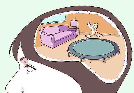Put them in your memory palace. Some people use what's sometimes known as a "memory palace" to remember things, including names. To create a memory palace, use somewhere you are familiar with in the real world that has multiple rooms or defined spaces, such as your house. Start by visualizing just 5 of those rooms or spaces. In each space, pick 5 pieces of furniture or items, and number them off in a logical way. When you want to remember something, place it in the memory palace. For example, maybe you want to remember Jon who enjoys trampolines. Visualize him jumping up and down on your bed in your memory palace.