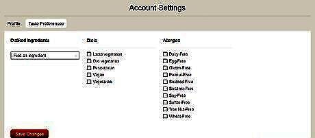 Configure your preferences. Once you're joined up, you can set a large range of preferences under the "Favorite Recipes" tab as follows: Ingredients Taste (sweet, sour, bitter, etc.) Cuisines Courses Time and Price Nutrition, Diets, and Allergies Favorites and Sources (this lists set recipe sites for you to select) Choose whether or not you want your FoodFinder searches restricted to your preferences.