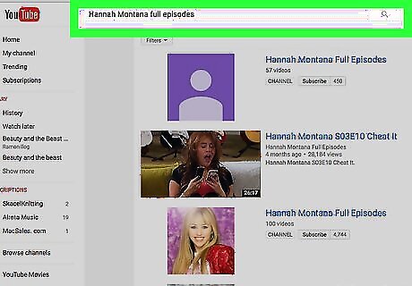 Search YouTube. If you have a show in mind, enter the show’s name in the search tab. Include the words “full episodes” to find the episodes rather than clips. Some videos will contain many episodes in a row. Other times, episodes are split up into several videos and may be organized in a playlist. For example, type “Hannah Montana full episodes” to specify full episodes posted of Hannah Montana. This is an easy to use option perfect for anyone who wants to watch full episodes on a trustworthy, familiar site.