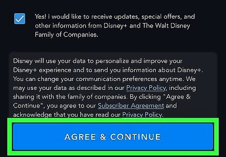 Scroll down and tap AGREE & CONTINUE. Tapping this large blue button confirms that you agree to Disney+'s Subscriber Agreement and Privacy Policy. You can read these documents by tapping their links above the button.