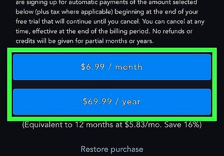 Tap a billing option. You can choose to be billed monthly ($6.99 USD/$8.99 CAD) or annually ($69.99 USD/$89.99 CAD). You will not be billed until your free 7-day trial period ends. If you cancel before the trial ends, you will never be charged. If you don't cancel before the end of the trial period, you'll be billed for the amount you select as soon as the period ends. Disney does not offer refunds or partial credits for cancellations.