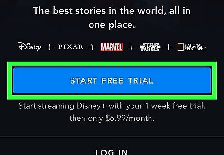 Tap START FREE TRIAL to sign up. If you haven't already created your account, tapping this large blue button will begin the process now. If you've already created an account, tap LOG IN at the bottom of the screen, and follow the on-screen instructions to sign in with your Disney+ email address and password.