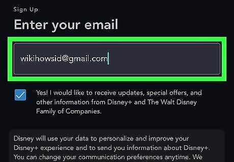 Enter your email address. You'll use this address to log in to the service. If you don't want Disney or their partners to contact you about offers and updates, tap the blue-and-white checkmark to remove it.