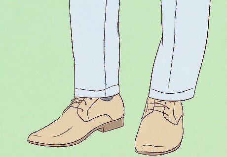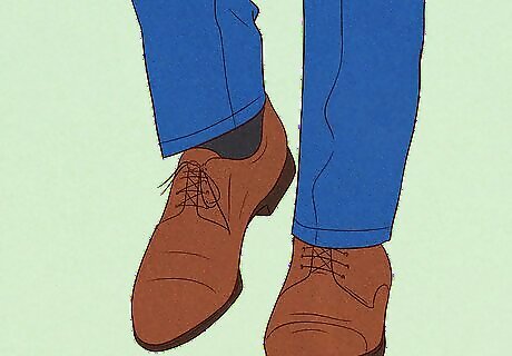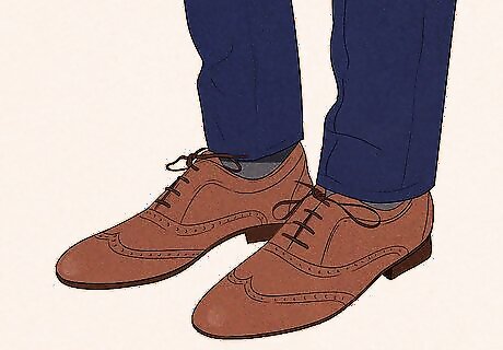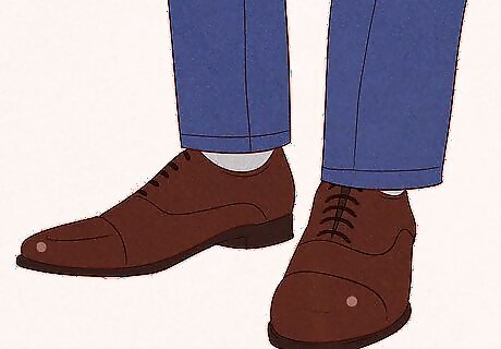 Wear a pair of black or dark brown dress shoes to keep the look conservative. These shades work well for the most formal events imaginable. Save your black shoes for places with a strict dress code. If the rules aren’t quite as demanding, try using a dark shade of brown instead. Be sure to choose a pair of dress shoes with rounded tips instead of pointed ones. Brown is far more versatile than black. If you have to choose one option, go with brown so you have shoes for a variety of settings.