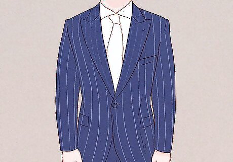 Wear a striped suit if you wish to look more informal. Every shade of blue has a pinstripe version. A pinstripe design consists of vertical stripes running down the entire suit. The stripes make the suit stand out more, so they are most common with darker shades of blue like navy. Choose a pinstripe design to add some flair to your outfit if you’re used to wearing plain suits all the time. Pinstripes come in different sizes. Since big stripes stand out so much, stick to thinner stripes to prevent your suit from becoming too informal and distracting. Pinstripe designs often come in handy for day to day business settings. However, you will need to choose ties and other accessories carefully to avoid any color clashes with the stripes.
