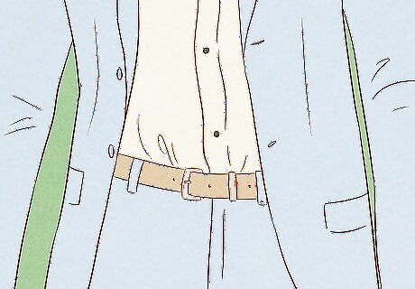 Match the belt to your shoes if you plan on wearing one. If you choose to wear a belt, get a shade of brown that matches your shoes. Don’t wear a belt with cream-colored shoes or sneakers. The belt will make your outfit look less formal, but that isn’t an issue when you know it is for a casual setting like a night out with friends. Instead of wearing a belt, consider using suspenders instead. Suspenders hold up your pants like a belt but can be hidden underneath your jacket. To avoid your outfit from getting too cluttered, don’t wear any other accessories. You don’t need a tie or a heavy watch for a casual outfit.