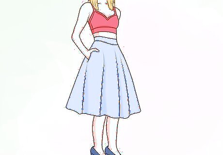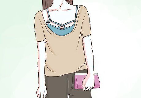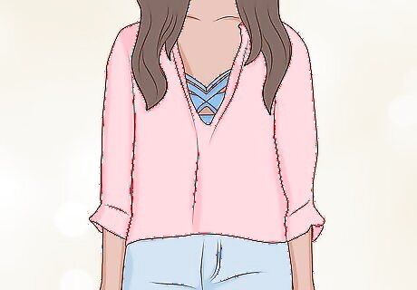 Put on a low cut shirt with the bralette. A low cut shirt is a great option to wear with a bralette. This is a sexy look that can be worn in a variety of ways—from super casual to dressed up for a night out. You can control how much skin you wan to show with this option. You could only show the top of the bralette or wear a very low cut shirt to reveal all of the bralette. Wear a low cut T-shirt with a lacy bralette and skinny jeans for a nighttime look. Put on a low cut tank top with a patterned bralette and a skirt.