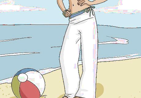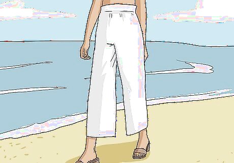 Select white linen pants for an option you can dress up or down. If you want to be able to wear your white linen pants to both casual and dressier occasions, choose pants in a crisp and classic white. White linen pants are particularly versatile and can be easily dressed up or down with the right top and accessories. For example, style your white linen pants with a silk top and gold jewelry for a more glamourous, party-ready outfit. Wear your white linen pants over a bathing suit with flip-flops for a cute and classic casual beach outfit.