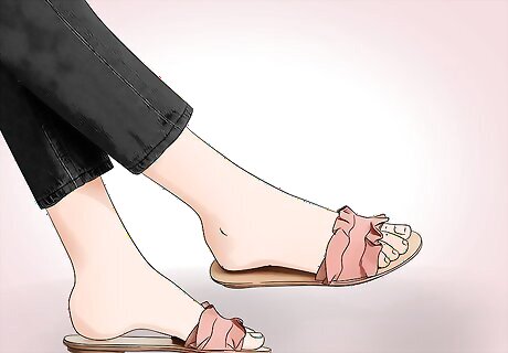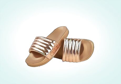 Dress up an everyday outfit with shiny slides. You don’t always need ruffles or fringe to rock a pair of head-turning slides. Shiny slides are an easy look that anyone can pull off without much effort. A simple pair of shiny black slides will draw attention to your toes, and add detail and interest to any outfit. Try wearing shiny black slides with cropped denim. You can also wear shiny slides with a skirt, sundress, or long shorts.