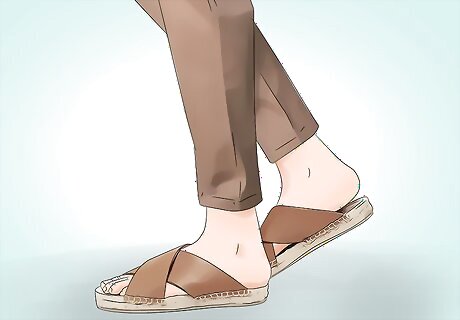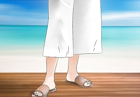 Wear crossed leather slides with khakis for a classic look. Try out a pair of leather slides with a leather cross band upper. These slides can be a summertime classic when paired with a pair of khaki shorts or linen pants. While perfect for a poolside afternoon or backyard barbeque, crossed leather slides are also dressy enough to make their way to an elegant seaside dinner. Try wearing crossed leather slides with dressy shorts and a polo shirt for a simple, casual look. Go for a pair in brown leather, as the color adds a touch of formality to the sandal.