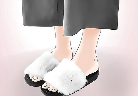 Wear furry slides with linen pants to make a bold statement. A pair of fuzzy, furry slides can turn an everyday outfit into something memorable. Try pairing your furry slides with an airy dress, business wear, or slouchy linen pants. You can also wear furry slides around the house for a updated, comfortable look on a lazy weekend or evening. Choose brightly colored furry clogs to add a pop of color and texture to your look. Wear neutral, fuzzy slides with a bold colored top and skirt.