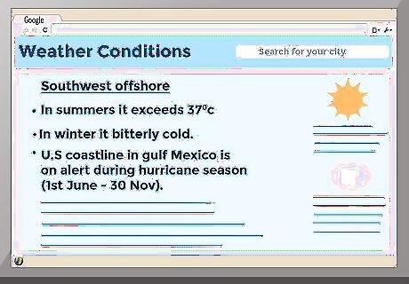 Research the weather conditions at your possible oil rig job. Oil rigs are often located in places with extreme weather conditions. Offshore and onshore rigs offer distinct challenges. Onshore rigs. Most oilfields in the United States are in the unforgiving climate of the Southwest, where summertime temperatures regularly exceed 100 degrees F (37.7 C). Drilling in the petroleum-rich fields of Canada reaches full capacity during the bitterly cold winter months, when the frozen ground is better able to withstand heavy equipment and exploration procedures. Offshore rigs. Workers on offshore oil rigs are at the mercy of the elements, too. North Sea platforms are battered year-round by strong winds and unyielding waves. Rigs dotting the U.S. coastline in the Gulf of Mexico are on alert during the hurricane season (June 1 to November 30).