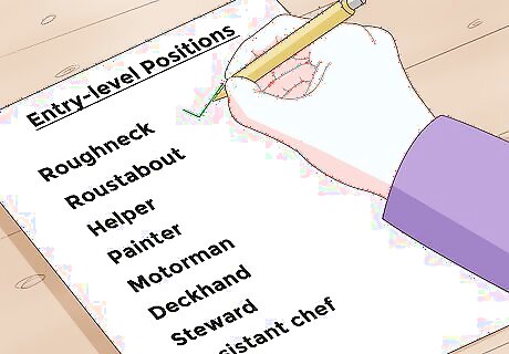 Choose an entry level position that suits you, if necessary. There are many jobs available for inexperienced workers to begin their careers. Roughneck: Roughnecks are general laborers who usually work on the rig deck. They move equipment and supplies, and also are responsible for cleaning equipment and work areas. Roustabout: These workers are involved in drilling operations. They often move sections of drill pipe and clean spill. Roustabouts aspire to one day become the tool pusher, the senior supervisor on a rig. Helper: Helpers assist skilled personnel, serving as apprentices for rig electricians, lead welders, and heavy-equipment operators. Painter: Offshore oil rigs, in particular, must be painted constantly to protect the structure from the corrosive effects of saltwater. This is a hazardous duty, as painters often must be suspended in harnesses to reach remote areas of the platform. Motorman: Motormen maintain and repair all rig machinery, including generators and deck equipment. Deckhand: Deckhands build tow lines to secure barges and boats to the structure, facilitating loading and offloading of cargo. Steward: Housekeeping needs, including laundry service and janitorial duties, must be met to ensure the smooth operation of an oil rig. Assistant chef: Galley hands, including assistant chefs, work around the clock to prepare meals for all shifts. This is a job where mainstream experience is directly transferable to duties on the rig.