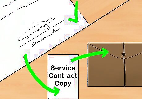 Sign the contract. When you and the other party are both in agreement that the contract is final, sign and date the contract and have the other party do so as well. Be aware that many companies use electronic signature services such as DocuSign or Adobe Document Cloud with eSign. These electronic signatures are used in place of a written signature and are legally binding. Keep a copy of the contract for your reference, and make sure the other party (or parties) has one as well. You may want to stipulate that the contract takes effect upon signing. In other cases, you may want the contract to take effect at a certain date.