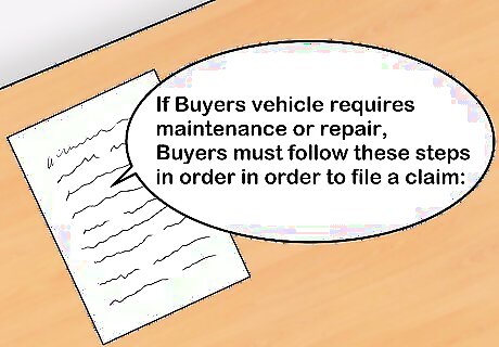 Determine how claims will be filed. Another important section will define how claims will be filed, which is to say how the buyer will ask the seller to perform any maintenance or repair. For example, if you are writing a service contract about a vehicle, a filing provision may look something like this: "If Buyers vehicle requires maintenance or repair, Buyers must follow these steps in order in order to file a claim: (1) Buyers must prevent further damage; (2) Buyers must take vehicle to a licensed repair facility; (3) Buyers must provide repair facility with a copy of this Agreement; (4) repair facility must obtain Sellers authorization to complete the work requested; (5) Buyers shall pay the required deductible (if applicable); and (6) Buyers shall provide Sellers with any and all receipts received as a result of a repair or maintenance."
