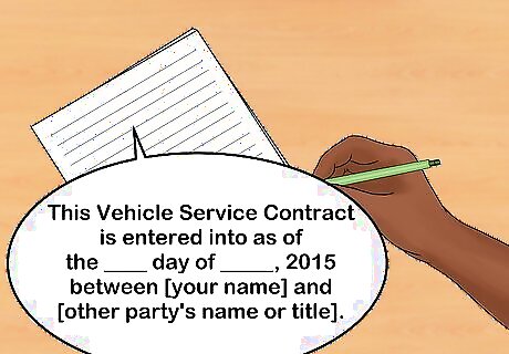 Start with each party's general information. At the beginning of every contract, you should include a title, a date, and any general information about the parties to that contract. For example, your service contract may be titled, "Vehicle Service Contract" and might open with a paragraph stating: "This Vehicle Service Contract is entered into as of the ____ day of _____, 2015 between [your name] and [other party's name or title]." You may follow this up with a description of each party, including each of their addresses, phone numbers, and email addresses.