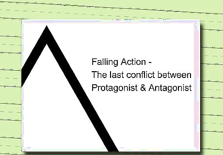 Lay down the falling action. Then comes the falling action. This is usually the last conflict that the protagonist encounters, and towards the end of the story, where he defeats the antagonist. This will be on the right side of the "v" on the witch's hat.