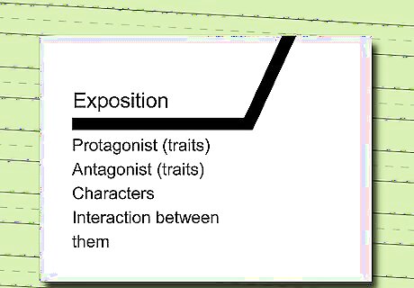 On the first line, on the far left, label it Exposition. Underneath it, write out the name of your protagonist, and a trait that makes them distinctive. Do the same for the antagonist. Then list the other important characters and their interaction with the protagonist or antagonist.