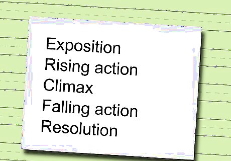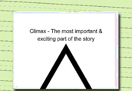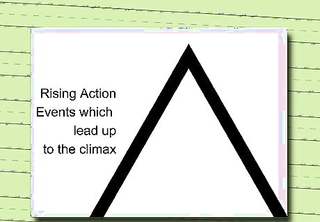 On the slope on the left of the up-side-down "v", label it "rising action" and write all the events the character faces, leading up to the climax.