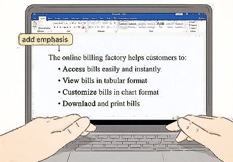 Add bold or italics for emphasis. Making the first word or phrase in each bullet point stand out from the rest of the text captures your reader's attention and makes the list easier to scan. This tactic is especially effective if the first word of each bullet point is a verb, or if you have a single word or short phrase followed by explanatory text. Be consistent with formatting. If you add bold or italics to one bullet point, use the same formatting with the others so they all look the same.