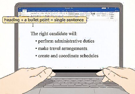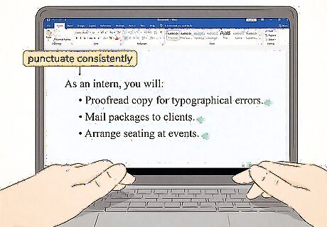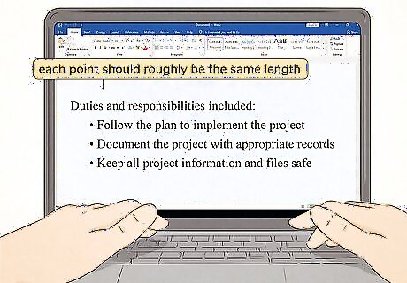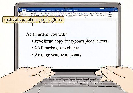 Start each bullet point with the same part of speech. Bullet points flow well if they have parallel constructions. If you start the first bullet point with a verb, start all the other bullet points with a verb as well. For example, if you have a bulleted list of job responsibilities for an intern at your company, you might start each bullet point with an action verb. You could write: Proofread copy for typographical errors Mail packages to clients Arrange seating at events If it's awkward or difficult to use the same part of speech for all of your bullet points, choose another way to convey the information so that they can all use the same construction. If you're writing a bulleted list to take notes on a lecture or book chapter, don't worry too much about parallel construction. Just try to get the information down in a way that will make sense to you later.