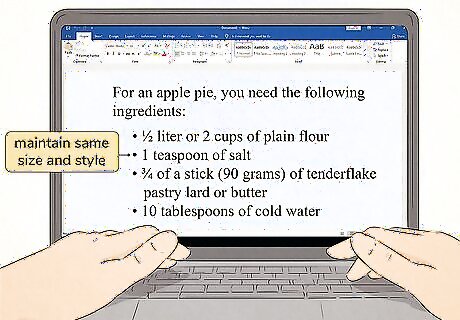 Set the same font and margins for the bulleted text. Most word processing programs format the font size and margins of bulleted lists automatically. Generally, it's best not to deviate from that default formatting. However, if you want to do more to make the list stand out from the rest of the article, make sure the bullets all line up and the formatting is consistent. If the list is part of a larger article, it generally looks best if you keep your bulleted text the same font size as the rest of the body text.