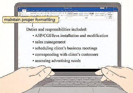Avoid overusing bulleted lists in a single document. Bullet points help emphasize information. However, if you have several lists over the course of a few pages, your readers will likely skim right over them. Use the list to highlight only the most important points of the document, and keep it to one list every 2-3 pages at most. If you're writing a more lengthy document, for example, you might use bulleted lists to summarize the key points of each section. An exception might be if you're writing a document like a résumé, which is commonly written as a series of several bulleted lists.