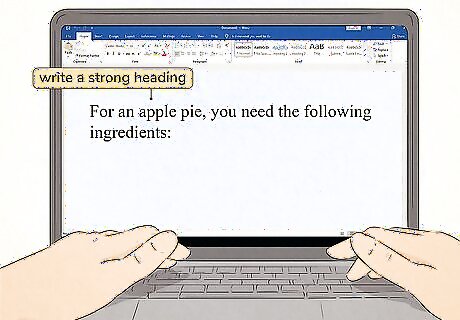 Write a strong heading to describe what the bullet points will cover. For some bulleted lists, you'll have a single heading with the type of items on the list. In other lists that fall within a larger article, you might have a sentence fragment that introduces the list, followed by a colon. For example, suppose you're writing a list of ingredients for an apple pie. You might simply write the word "Ingredients" followed by a bulleted list of the ingredients. On the other hand, if you were writing a longer article about traditional American desserts, you could write "For an apple pie, you need the following ingredients," followed by a colon, then start the bulleted list of ingredients on the next line.