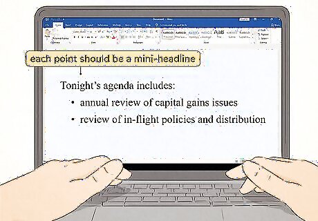 Edit each point into a mini-headline that grabs the reader's attention. Whether your bulleted list will be included in a serious business paper or presentation or used as advertising copy, it's something you want your readers to pay attention to. Do this by using persuasive language that fascinates your readers and compels them to read. For example, suppose you're writing up a list of responsibilities for interns. While this doesn't sound like a task that requires you to make your writing particularly exciting, it's still an opportunity to get potential interns excited about being part of the organization and feel as though they're an important part of the team. In sales copy, use words such as "unbelievable" and "little known" to encourage your readers to believe you're letting them in on a secret.