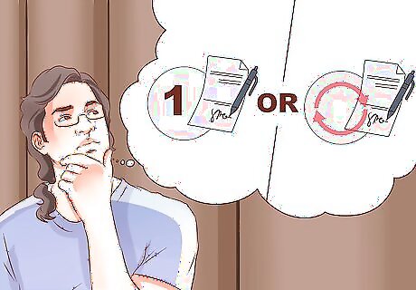 Consider whether the contract needs to be ongoing or one-time. If the contract sets up a long-term relationship between the parties, make sure to specify the end date for that relationship. For example, if you own a business that sells homemade pies and you enter into a contract to sell your pies to a local grocery store, you should specify the length of the obligation to sell the pies to the store, e.g. one month, one year, etc. If the contract simply covers a one-time transaction, there is no need to specify that the contract will end after the completion of performance. For example, if you sell your car to someone and write up a contract for the sale, you don't need to specify that the contract will cease to have an effect when you sell the car and the buyer pays the money.