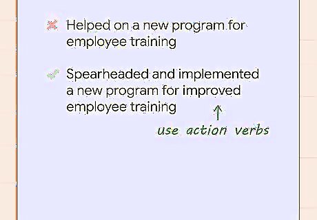 Use action verbs when describing your experience. Make yourself sound like a dynamic worker with active language. Wherever possible, use words that convey action and activity. Recruiters will view you as a more engaged employee. Also change up the words you use. Don’t keep repeating the same verbs. If you don’t know where to start, begin by writing a list of good action words. Designed, created, spearheaded, led, oversaw, and words like these are good choices. Weaker words include helped, assisted, or worked. They are verbs, but not especially active ones. Replace them with better alternatives. Incorporate these action words into your bullet points. Don’t say “Helped on a new program for employee training,” say “Spearheaded and implemented a new program for improved employee training.