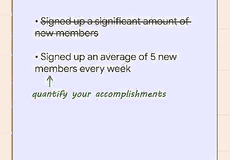 Include statistics wherever you can. Recruiters like seeing numbers on a resume. Numbers are not only easier to read, but they also provide a much more concrete example for your experience. Quantify your experience wherever possible so recruiters have clear examples of your productivity. Saying “Signed up a significant amount of new members” is nonspecific and wordy. Saying “Signed up an average of 5 new members every week” quantifies your accomplishments and makes the resume easier to read. Don’t make any false claims with these numbers. If you claim you increased sales by 30% but sales actually fell while you were there, your potential employer could find out you’re lying. Getting caught lying will end your chances of landing the job.