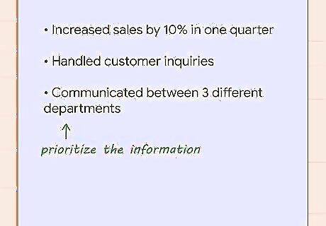 Prioritize the information that should appear first on the list. Recruiters scan resumes quickly, so make all the important information easy to see. Under each job you held, list your bullet points in order of importance. That way, recruiters will see your biggest accomplishments first. This makes you a more attractive job candidate. For example, 3 of your bullet points may be “Increased sales by 10% in one quarter,” “Handled customer inquiries,” and “Communicated between 3 different departments.” That first one is the biggest accomplishment since it shows a clear way that you improved the company you were at. It should come first on the list.