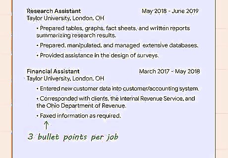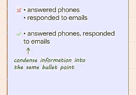 Condense information into the same bullet point. Saving space is important in your job descriptions. Don't waste space on redundant information. Review the bullet points you wrote and see if any of them can be condensed into one. Look for categories like communications, sales skills, and organization. List multiple skills in each bullet point to save space. Don’t use a separate bullet point for “answered phones” and “responded to emails.” Condense them by having a bullet point on your communication skills. Then replace that bullet point with a new one listing a different skill.