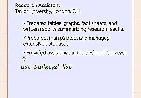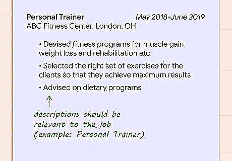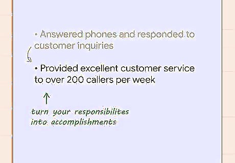 Explain your accomplishments more than your responsibilities. In some cases, recruiters can tell what your job responsibilities were from your job title. For example, most recruiters know what restaurant servers, receptionists, teachers, or cashiers do in their jobs. Listing responsibilities doesn’t add much more detail, and recruiters may stop reading your resume. Instead, catch their attention by highlighting what you accomplished with your work. Rather than saying you worked with customers, state that you closed an average of 10 sales per week. This detail gives the recruiter a better idea of the kind of worker you are. Think about anything that you improved while at your past jobs, even if it seems small to you. You may think “Standardized communication between 4 different departments” doesn’t sound impressive, but a potential employer may like your organization and initiative. You don’t need to change the information you present, you just have to write it in a more active way. “Answered phones and responded to customer inquiries” sounds very passive and more like a responsibility. However, “Provided excellent customer service to over 200 callers per week” makes your work sound like a real achievement. In some cases, a job title doesn't accurately describe your duties. Use one of your bullet points to give a quick description of your job if it isn't clear from your job title.