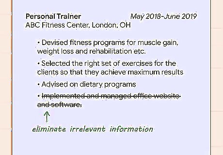 Eliminate information that doesn't relate to the job you're applying for. While you may feel like everything about your previous work experience is important, recruiters only want to see information that applies to their needs. Review all of your bullet points and eliminate everything that doesn't specifically show why you're perfect for this job. All the information you delete gives you more room to add different information that is more specific to this job. If you aren't sure what's directly relevant to this job, go back and check the posted job description. See what the employer is looking for in a job candidate. Then tailor your bullet points to address what this company wants.