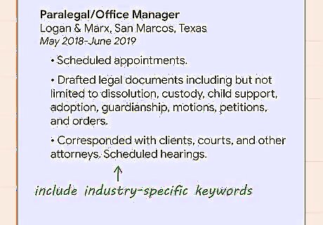 Include industry-specific keywords to attract attention. Making your resume relevant to each job you apply for requires using the right wording. All industries have specific keywords and buzzwords that get attention. Sprinkle these words in your job descriptions to show that you’re a qualified candidate. For instance, if you apply for a job in the computer field, specifically list languages you know like HTML, Java, and JavaScript. A recruiter can then easily see that you have past experience in the fields they need. If you’re currently working in the industry you’re applying for, then you probably already know the keywords. If not, do some research. Check online or ask someone in the field what recruiters like to see. Using effective keywords is especially important because more and more companies are using software to screen resumes before recruiters even see them. You could be a qualified candidate but never get an interview because the software didn’t see any relevant keywords on your application.